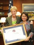MA. CECILIA FLORES-OEBANDA, president and executive director of Visayan Forum Foundation, Inc., accepts the first Iqbal Masih Award for the Elimination of Child Labor from Ambassador Kristie Kenney.